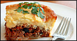 MouSsaka Layers of potatoes, minced meat, aubergines, courgettes & béchamel sauce....................................................................................................................................................15.95Stifado Beef cubes cooked slowly with tomato and onions....................................................................17.50Kleftiko Lamb on the bone slow cooked with herbs and spices.....................................................................................................................................................................................................18.50Lemonato Lean cubes of pork in lemon sauce...................................................................................................15.95Keftedes Home-made meatballs in tomato sauce...........................................................................................15.95Kotopoulo Skordato Chicken fillet in a creamy garlic and wine sauce........................................................................................................................................................................................15.95Kotopoulo Spanaki Chicken fillet with spinach & feta cheese in a creamy sauce............................................................................................................................................15.95Kotopoulo Aphrodite Chicken fillet ouzo flamed, in light tomato and cream sauce..................................................................................................................................................15.95Kotopoulo A LA CREME Chicken fillet with mushrooms in a creamy sauce.................................................................................................................................................................................15.95Vegetarian Mousaka Layers of potatoes, tomato and herbs, aubergines, courgettes & béchamel sauce......................................................................................15.50Imam Bayildi Aubergines stuffed with onion, garlic, parsley & herbs – oven baked..................................................................................................................................15.50Dolmades (Home made) Vine leaves stuffed with rice, herbs and spices....................................................................................................................................................................................15.50