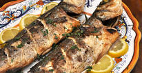 CalamariDeep fried squid in batter.................................................................................................................................................................16.50SEA BASSSea bass fillet, charcoal grilled.....................................................................................................................................................17.95SOLOMOS Salmon fillet, charcoal grilled........................................................................................................................................................17.95Garides SkarasCharcoal grilled king prawns..........................................................................................................................................................17.95Garides Skordates King prawns in wine & garlic sauce..........................................................................................................................................17.95